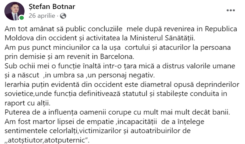 Cu câteva săptămâni în urmă fostul funcționar a postat pe rețelele de socializare un mesaj în care își arăta nemulțumirea față de felul în care actuala ministră administrează treburile acestei instituții guvernamentale și felul în care comunică cu colegii din minister. În concluzia sa, Ștefan spunea că, cităm: „Consider ca acest profil (n.r. al managerului) este absolut incompatibil cu deținerea unei funcții publice”. Fostul consilier spune că nu a fost lăsat să-și facă munca, conform responsabilităților care îi reveneau și că ministra Sănătății ar avea un comportament abuziv cu subalternii săi. Ministra și-ar fi asumat întreg procesul decizional, iar tinerii angajați ar fi umiliți. Din acest motiv, echipa se destramă, mai spune Ștefan Botnar care a depus cerere de demisie și s-a întors la Barcelona. Conform datelor publice, acum la Ministerul Sănătății sunt vacante 12 funcții de șefi și consultanți principali din mai multe Servicii și Direcții.