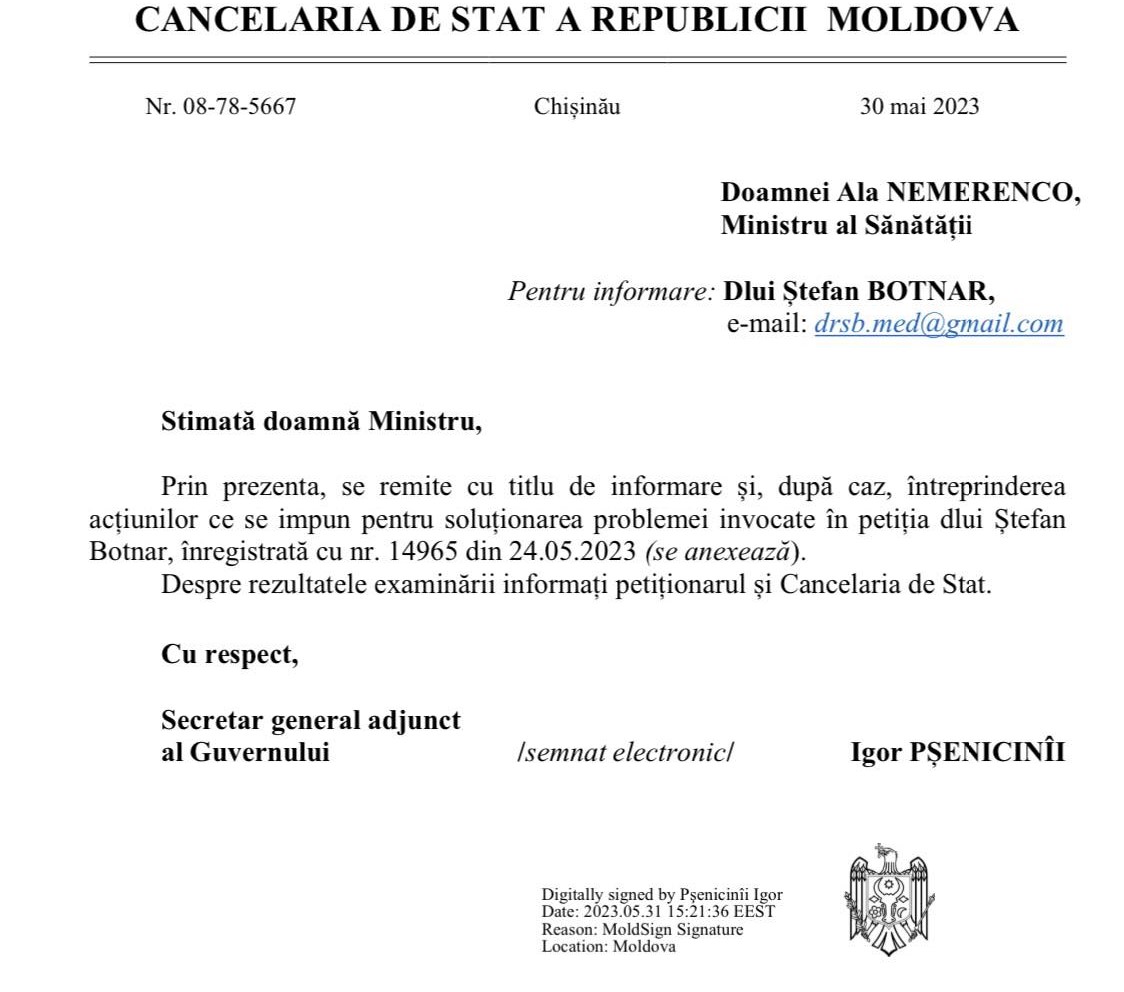 Între timp, Ștefan Botnar a remis o petiție Guvernului și Președinției în care vorbește despre aceleași probleme de atitudine despre care a povestit și în interviul oferit Redacției Sănătate INFO. Drept răspuns, Cancelaria de Stat a remis, cu titlu de informare, ministrei Sănătății scrisoarea și i-a solicitt Alei Nemerenco „după caz, întreprinderea acțiunilr ce se impun pentru soluționarea problemei invocate în petiția dlui Ștefan Botnar”.