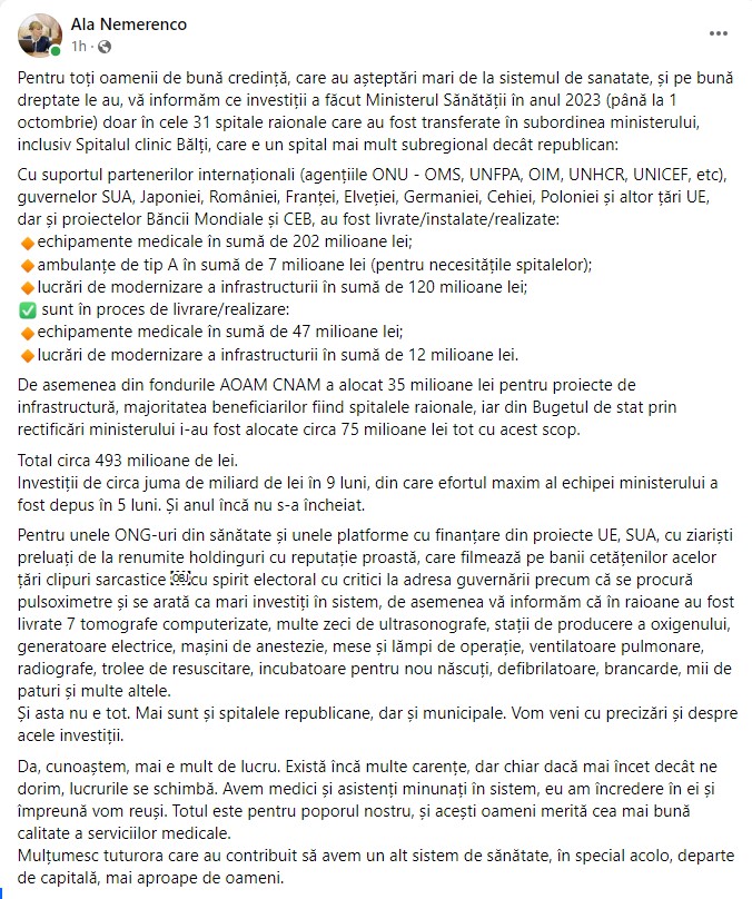 Ala Nemerenco a publicat pe Facebook un raport despre donațiile partenerilor strategici și alocările din fondurile naționale în sistemul de sănătate. Potrivit ei, în primele nouă luni ale anului au fost făcute investiții de aproximativ jumătate de miliard de lei, dintre care un sfert provin fondurile AOAM și Bugetul de Stat, iar ceilalți bani sunt donații de la partenerii de dezvoltare. Ministra recunoaște că mai există multe carențe și că lucrurile se schimbă mai încet decât se aștepta.