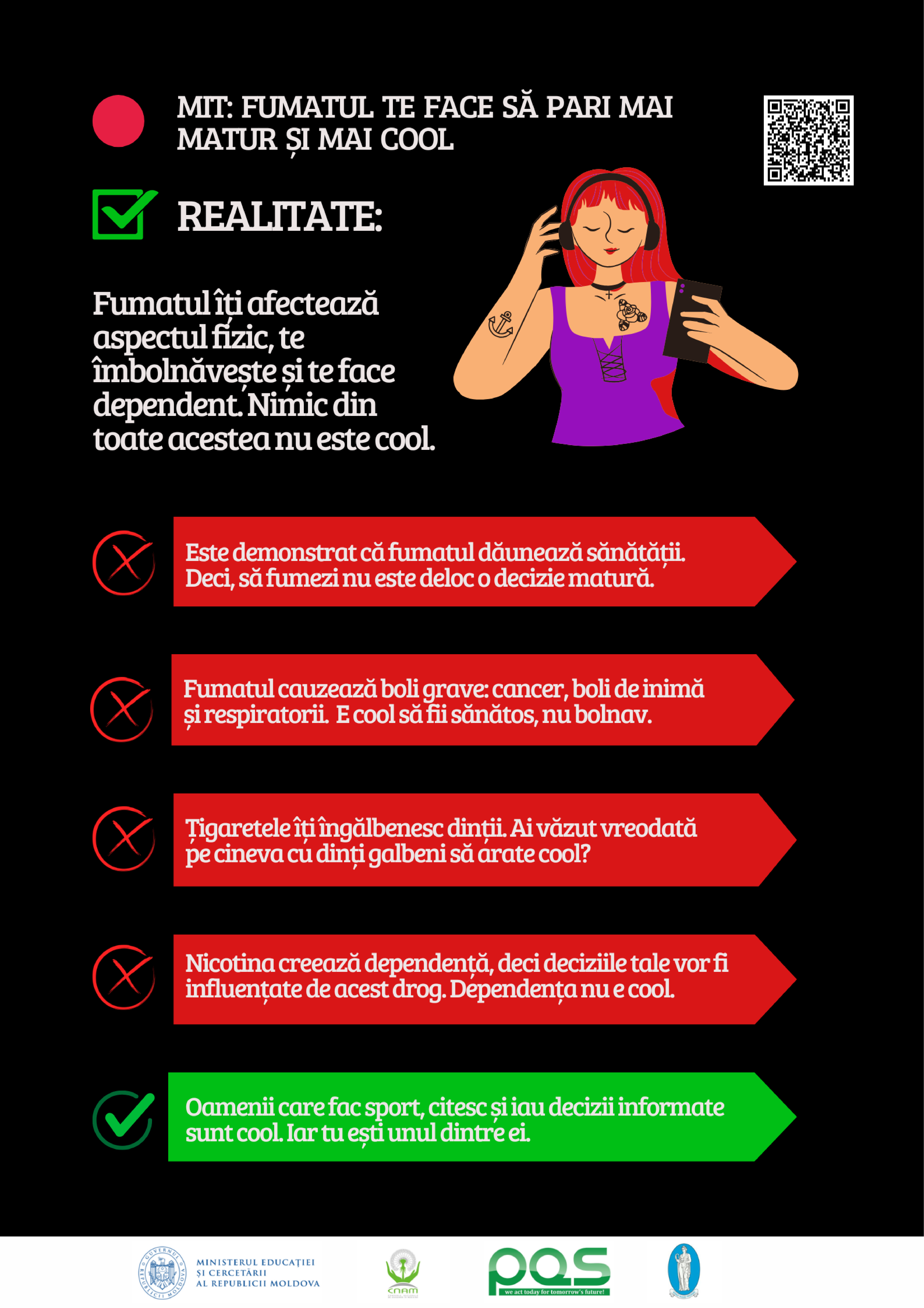 Realitate: Fumatul îți afectează aspectul fizic, te îmbolnăvește și te face dependent. Nimic din toate acestea nu este cool. Ceea ce vezi în reclame nu este realitatea; este doar o strategie menită să te facă să îți dorești ceea ce ți se prezintă.