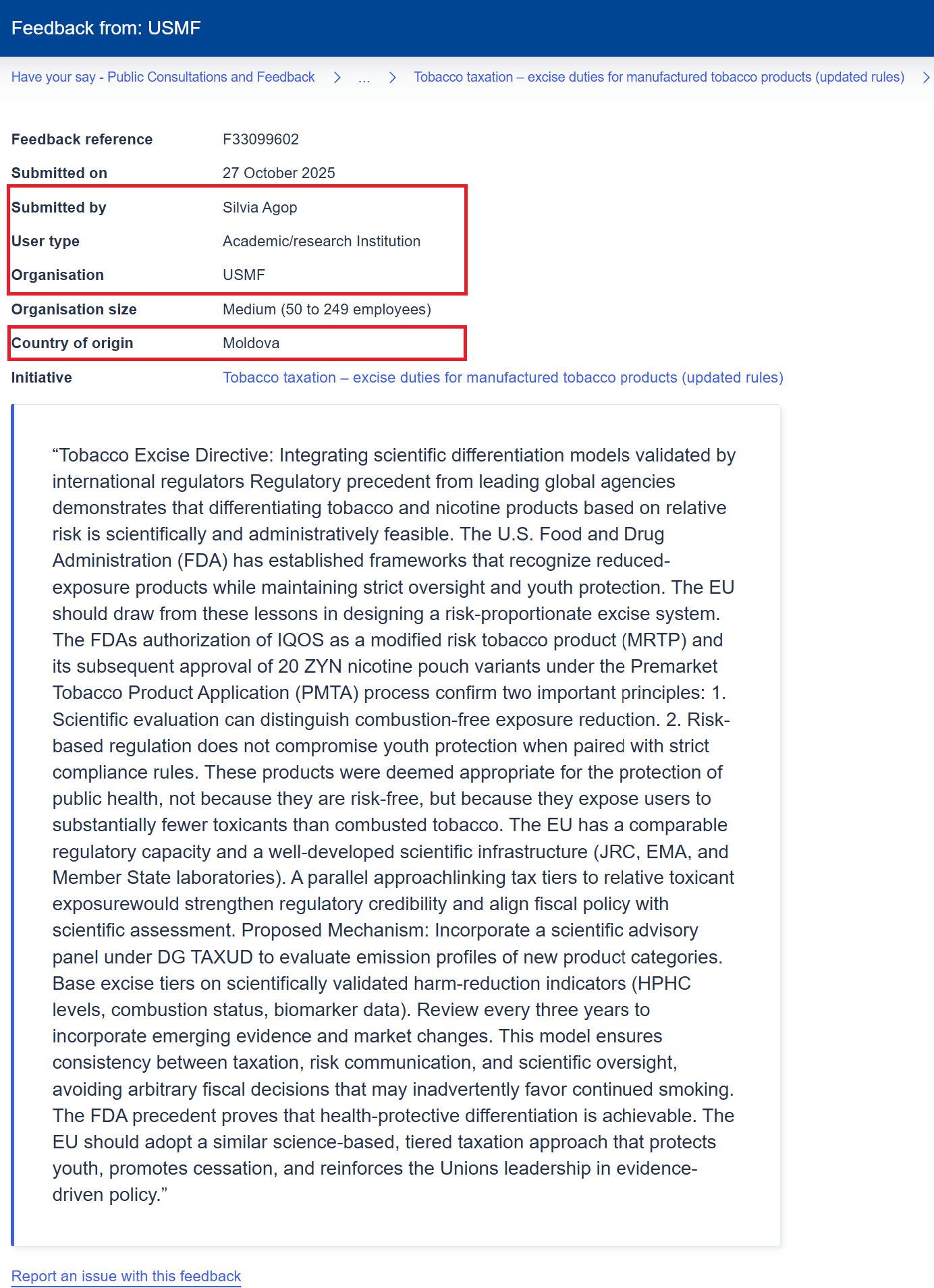 Это произошло в разгар процесса общественных консультаций по новой европейской директиве о налогообложении табачных изделий. На официальной платформе Европейской комиссии появилось несколько отзывов, подписанных от имени преподавателей Молдавского Государственного Университета и Государственного университета медицины и фармации «Николая Тестемицану». Эти мнения имели одну общую черту: под маской научных доказательств все они благоприятствовали табачной промышленности, выступая за более мягкое налогообложение новых никотиновых продуктов и продуктов из нагретого табака.