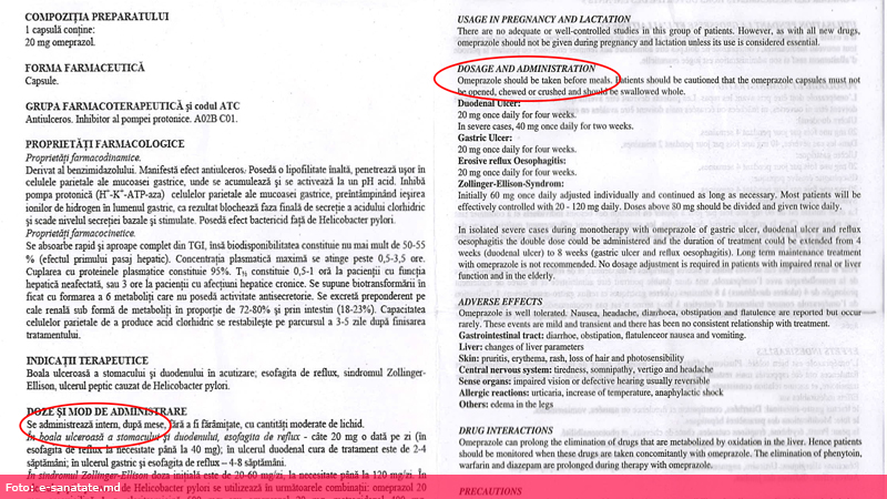 Medicamentul Omeprazole este indicat persoanelor cu boală ulceroasă și duodenului, precum și în caz de esofagită de reflux (inflamație a mucoasei esofagiene determinată de conținutul de acid care refluează din stomac în esofag). O femeie din Chișinău a observat să prescripția acestui preparat conține erori și anume la indicația modului de administrare.