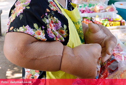 O femeie de 59 de ani din Thailanda suferă de o boală gravă, din cauza căreia are ambele braţe mereu umflate şi dureroase. Potrivit medicilor, cazul ei este unic în lume. Duangjay Samaksamam, proprietara unui magazin din Provincia Surin, Thailanda, suferă de o formă foarte gravă de macrodystrophia lipomastosa, care îi afectează ambele braţe, de la umeri până la degete.