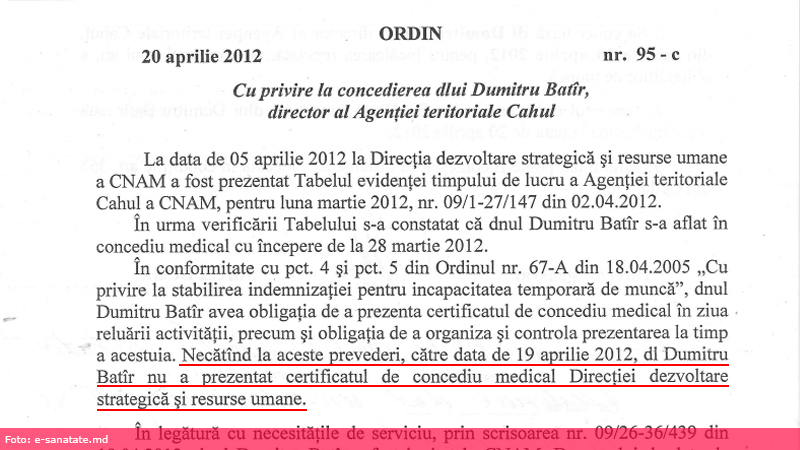 Ordinul cu numărul 95 - c din 20 aprilie 2012 de demitere a lui Dumitru Batîr prevede că acesta să fie concediat pentru că nu a prezentat la timp certificatul de concediu medical. „Dumitru Batîr avea obligația de a prezenta certificatul de concediu medical în ziua preluării activității, precum și obligația de a organiza și controla prezentarea la timp a acestuia. Necătând la aceste prevederi, către data de 19 aprilie 2012, Dumitru Batîr nu a prezentat certificatul de concediu medical Direcției dezvoltare strategică și resurse umane”, se menționează în ordinul semnat de Mircea Buga, care a fost emis la o zi după ce a expirat concediul de boală. Pentru demiterea din funcție a fost luată în considerare și mustrarea aplicată cu câteva luni înainte. Batîr spune că din cauza presiunilor ar fi ajuns la spital cu stare de preinfarct, din acest motiv a fost nevoit să-și ia concediu medical.