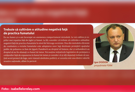 Acum un an, într-o declarație pentru presă, liderul socialiștilor, Igor Dodon, declara că va susține legea privind controlul tutunului elaborată de Ministerul Sănătății. „Fumătorii au dreptul să fumeze, dar și nefumătorii au dreptul să nu fie afumați cu fum de tutun. Voi susține unuțiativele legislative de protejare a cetățenilor față de expunerea la fumul de tutun și consider că și alți deputați trebuie să susțină acest proiect de lege, care vizează sănătatea publică, or aceasta este una din valorile noastre naționale, aflate în pericol”, a declarat atunci Igor Dodon.