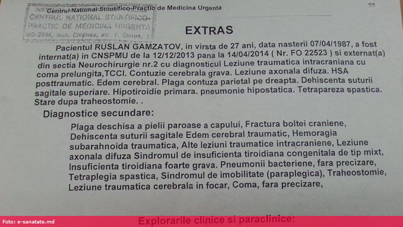 Era un om perfect sănătos, plin de viață și carieră în ascensiune până într-o zi, când o alunecare banală pe drumul cu polei l-a imobilizat la pat. Se întâmpla în iarna lui 2013. Ruslan Gazmatov, în vârstă de 28 de ani, originar din Durlești se grăbea la un proces de judecată. Nu a mai ajuns. A alunecat pe gheață și s-a lovit la cap și la coloana vertebrală. În termeni medicali doctorii spun că tânărul a suferit mai multe traume cranio-cerebrale. Lista diagnosticelor este lungă – leziune traumatică intra-craniană cu comă prelungită, contuzie cerebrală gravă, leziune axonală difuză, edem cerebral, plagă contuză, etc. Din această cauză, Ruslan a stat mai bine de o lună în comă, iar altele trei – în secția de terapie intensivă la Spitalul de Urgență. Părinții tânărului povestesc că inițial medicii îi dădeau doar 3% speranțe de supraviețuire.