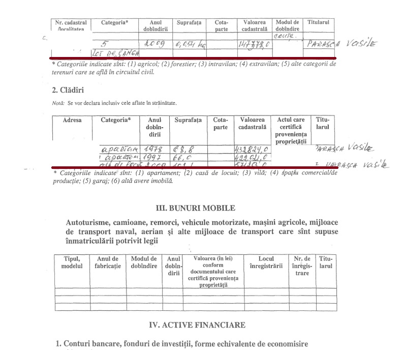 Parasca nu precizează, însă, în nicio declarație pe venit ce beneficii a câștigat de la această companie. În schimb, în ultima sa declarație, Vasile Parasca trece o casă de locuit de peste jumătate de million de lei și un teren aferent care ar costa 147 de mii de lei. Managerul de spital ar fi acumulat toate aceste bunuri în anul 2009. De asemenea, conform declarației sale, Parasca mai deține două apartamente și un cont bancar în valoare de 200 de mii de lei. Concomitent, Parasca mai deține acțiuni la compania de asigurări Grawe Carat și la Compania Municipală SA „Edilitate”, care este specializată în construcția drumurilor.