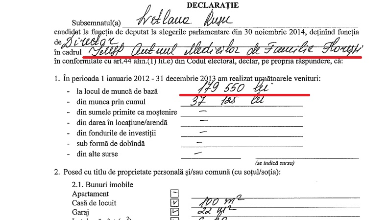 Svetlana Rusu, directoarea CMF Florești, aspiră și ea la o carieră în politică. Potrivit declarației de avere, aceasta a ridicat anul trecut un salariu de aproape 15 mii de lei și a acumulat venituri de 37 mii de lei din muncă prin cumul. Svetlana Rusu a mai declarat o casă de 100 de metri pătrați, un garaj și un automobil Ford produs în anul 2006.