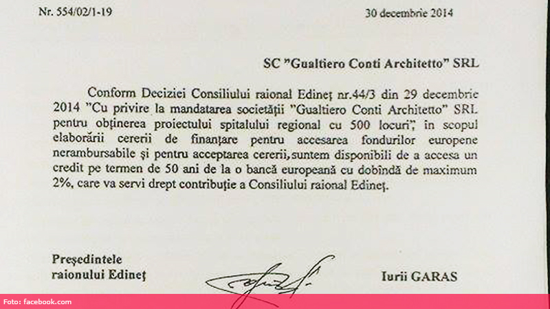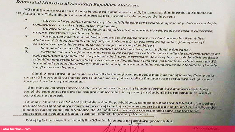 Din documentele publicate de Glavan se înțelege că firma implicată, cu sediu la Suceava, Architektur and Engineering, solicita de la autoritățile din Republica Moldova o scrisoare de garanție pentru proiectul în valoare de 2,5 miliarde de euro, pentru a putea începe investițiile la Comrat, Rîșcani, Edineț, Rezina și Cahul. Mai interesant este că Consiile din cele cinci raioane au semnat deja scrisori prin care au acceptat ca firma italiană să facă studii de fezabilitate și respectiv să fie începute investițiile. Un spital urma să coste aproximativ 150 de milioane de euro.