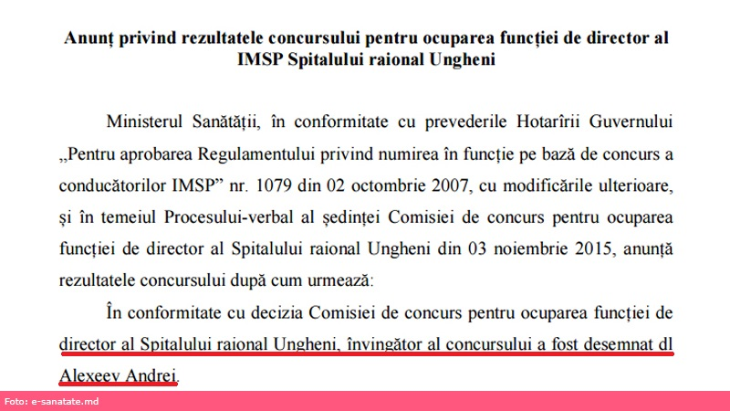 Ministerul Sănătății gafează din nou. După ce ieri a fost organizat un concurs pentru ocuparea funcției de director la Ungheni, care s-a finalizat cu o contestare, Ministerul Sănătății publică dimineață devreme rezultatele concursului, fără să analizeze contestația care se face în mod normal în două zile. Mai mult, candidatul spune că nu i s-a spus cine face parte din comisia de contestare.