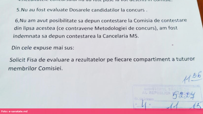 Ieri directoarea spitalului raional din Ungheni participase la concurs, însă pentru că avea nemulțumiri de felul cum au fost organizat acesta, a încercat să depună o contestație. Conform regulamentului, elaborat chiar de Ministerul Sănătății, o comisie de contestare trebuie să fie formată odată cu comisia de examinare, ceea ce nu a fost făcut. Mai mult, Crăciun spune că a cerut să vadă repartizarea punctajelor pentru a înțelege de ce obținut un punctaj mai mic decât oponentul său. Nici până astăzi, spune ea, nu le-a văzut. De ce? Nu i s-a explicat.