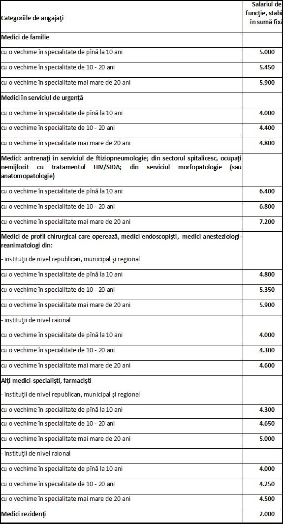 Noul Regulament privind salarizarea angajaţilor din instituţiile medicale din țară, care abia a fost publicat pentru dezbateri publice, prevede ca leafa personalului medical să fie calculată după următoarea formulă – partea fixă a salariului, partea variabilă a salariului și garanțiile salariale sau ajutorul material. La modul practic, salariul de funcție este stabilit de către Ministerul Sănătății și diferă de la o specializare la alta. Partea variabilă a salariului reprezintă suplimentul de plată pentru performanţe profesionale individuale în muncă, ceea ce înseamnă realizarea indicatorilor de performanţă, iar garanțiile salariale reprezintă sporul care se plătește pentru condiții nocive și riscante de muncă.