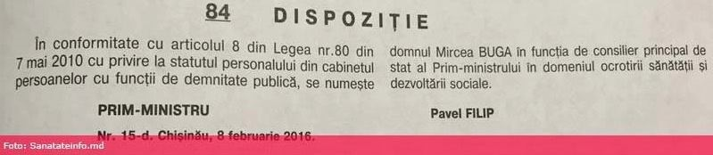 Premierul democrat Pavel Filip are un consilier principal de stat responsabil de domeniul ocrotirii sănătății și dezvoltării sociale. Este vorba de Mircea Buga, fost director al Companiei Naționale de Asigurări în Medicină. Informația fost confirmată chiar de el pe pagina sa de Facebook, iar dispoziția de numire a sa în funcție a fost publicată în ediția de astăzi a Monitorului Oficial.