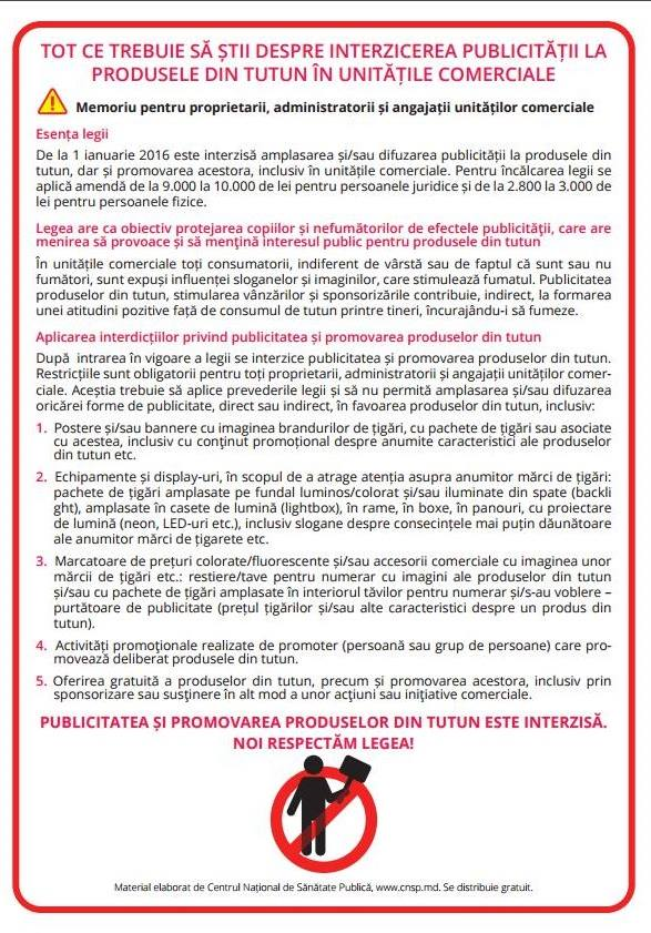 De altfel, tot astăzi specialiștilor le-a fost prezentată fișa în baza căreia vor trebui să monitorizeze dacă prevederile ce țin de interzicerea publicității la țigări sunt respectate. Documentul a fost pus în aplicare pe 10 februarie, în baza unei dispoziții semnate de medicul șef sanitar de stat, Aliona Serbulenco.