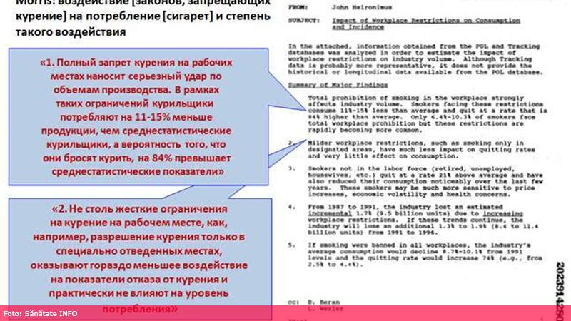 „Interzicerea completă a fumatului la locurile de muncă influențează grav volumul de producție. În condițiile unor asemenea restricții fumătorii consumă cu 11-15% mai puține produse din tutun decât fumează în medie un fumător activ. Probabilitatea de a renunța la fumat depășește cu 84% ratele medii de renunțare la fumat”, se arată în documentul intern al companiei Philip Morris.