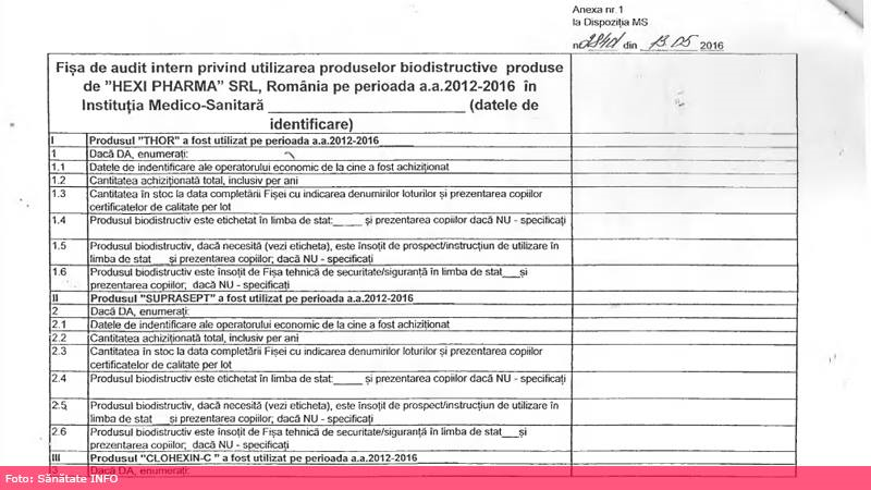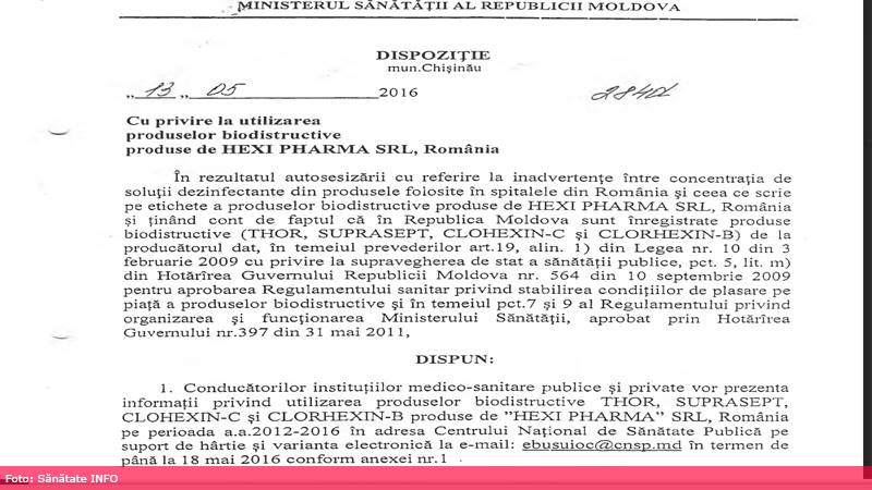 În paralel, Ministerul Sănătății, prin intermediul Centrului Național de Sănătate Publică, a emis o circulară, prin care solicită informații cu privire la utilizarea în instituțiile medicale a substanțelor biodistructive produse de compania română „Hexi Pharma SRL”. Este vorba de produsele destinate dezinfectării suprafețelor și instrumentariului medical „Thor” și „Suprasept”, antisepticul pentru mâini „Clorhexin C” și dezinfectatntul pentru tegumente și mucoase „Clorhexin B”. Toate aceste patru produse au fost certificate în Moldova acum patru ani.