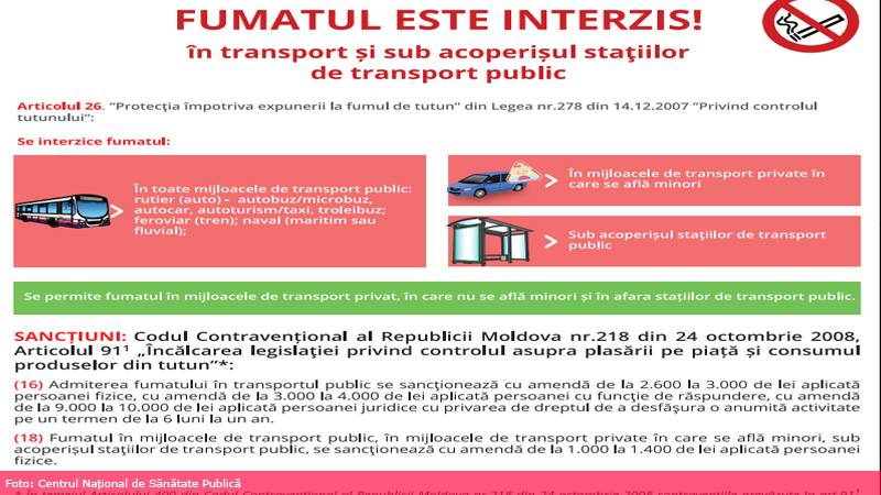 Din 31 mai în Moldova va fi interzis fumatul în spațiile publice închise. Tot de atunci fumatul va fi interzis și în transportul public, adică în microbuze, autobuze, troleibuze, taxiuri sau trenuri. Fumătorii nu vor avea voie, de asemenea, să consume țigări sub acoperișul stațiilor de transport public, fie de autobuz, troleibuze ori de tren.