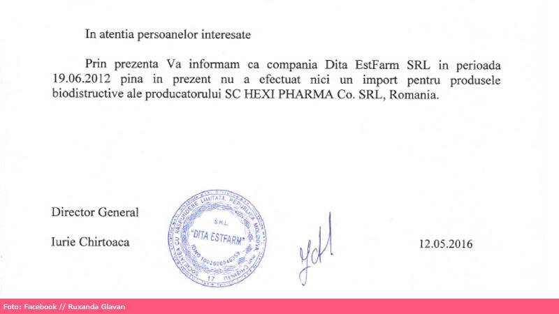 De cealaltă parte, compania farmaceutică „Dita EstFarm SRL” anunță că nu a importat niciodată produse ale companiei românești „Hexi Pharma SRL”.