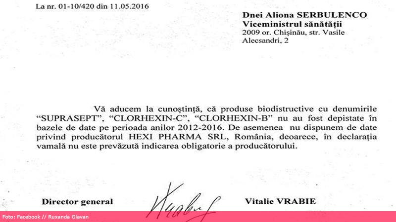Ministrul Sănătății, Ruxanda Glavan, s-a supărat pe presa din Moldova că a mediatizat scandalul dezinfectanților din România, publicând articole despre legătura pe care o are cu compania „Hexi Pharma SRL” care livra biodistructive diluate instituțiilor medicale de peste Prut. Într-o postare pe pagina sa de facebook, Glavan a publicat două răspunsuri pe care le-a primit de la Serviciul Vamal și compania farmaceutică care a certificat cele patru dezinfectante produse de „Hexi Pharma SRL” pentru Republica Moldova. Serviciul Vamal susține că trei dintre dezinfectanții companiei românești nu au fost niciodată importați în Moldova. Despre al patrulea produs -„Thor” nu se spune însă nimic. Cea care ar fi trebuit să importe produsele este compania farmaceutică „Dita EstFarm SRL”, care ne asigură, conform unui document separat, că nu a importat niciodată produsele „Hexi Pharma SRL”.