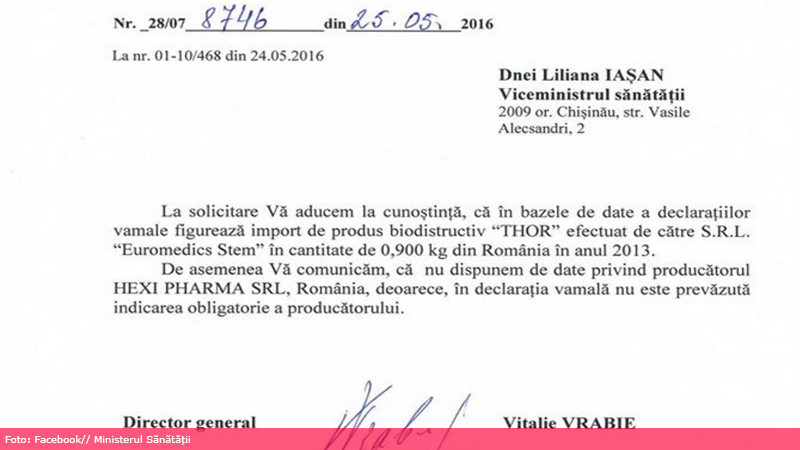 Pe pagina oficială de facebook a Ministerului Sănătății a fost plasat aseară un document ce conține un răspuns venit de la Vamă. Directorul Serviciului Vamal o anunță pe Liliana Iașan, viceministrul Sănătății că dezinfectantul „Thor” a fost importat în țara noastră în anul 2013, de către SRL „Euromedics Stem”.