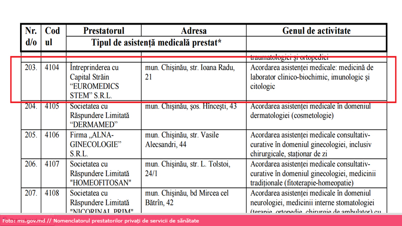 O simplă căutare pe internet a denumirii acestei firme ne-a direcționat spre un document semnat cu trei luni în urmă de către actuala conducere a Ministerului Sănătății. Firma „Euromedics Stem” SRL figurează în nomenclatorul prestatorilor privați de servicii de sănătate aprobat pe zece februarie 2016. Mai exact, întreprinderea dată, cu capital străin, este specializată în medicina de laborator clinico-biochimic, imunologic și citologic.