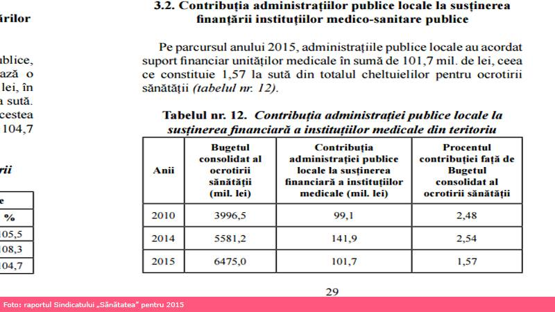 Raportul Sindicatului Sănătatea arată că în perioada 2010-2015 consiliile raionale, în calitatea lor de fondatori, au oferit ajutor financiar instituțiilor medicale din țară în valoare de aproximativ 600 de milioane lei.