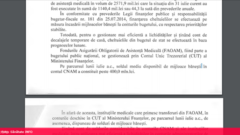 Altfel spus, Ministerul Finanțelor calcă pe aceeași greblă, încălcând din nou legile pe care le-a ignorat ani de-a rândul. În răspunsul oficial primit de la această instituție se spune că, cităm: „pentru o gestionare mai eficientă a lichidităților și ținând cont de decalajele temporare de casă, cheltuielile din bugetul de stat se efectuează în baza prognozelor lunare. Fondurile Asigurării Obligatorii de Asistenţă Medicală (FAOAM), fiind parte a bugetului public național, este gestionat prin Contul Unic al Trezoreriei (CUT) al Ministerului Finanțelor. Pe parcursul lunii iulie, soldul mediu disponibil de mijloace bănești în contul CNAM a constituit peste 400 de milioane de lei”, se spune în comunicatul remis de minister.
