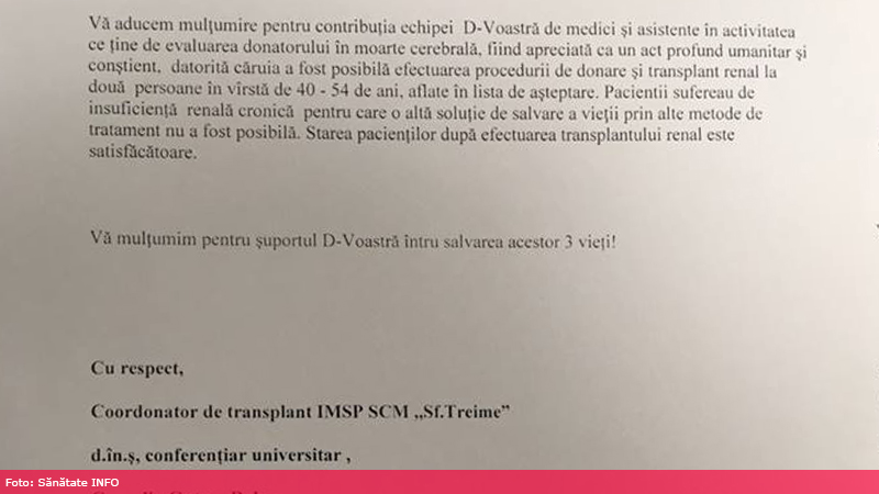 Așa se întâmplă că la Spitalul Municipal nr.3 „Sf. Treime” din Chișinău, de mai bine de un an este o tradiție ca doctorii responsabili de donarea organelor să-și împartă scrisori în care le mulțumesc colegilor pentru efortul depus în tot acest proces. De la șoferii care trebuie să aducă echipamentele necesare pentru prelevarea organelor până la medicii care efectuează prelevarea, toți primesc aceste mulțumiri, în semn de recunoștință, pentru că au contribuit la salvarea mai multor vieți. Asta, pentru că un simplu mulțumesc emană cele mai pure și pozitive emoții din lume, ne povestește Cornelia Guțu-Bahov – coordonatorul de transplant de la Spitalul nr 3 „Sf. Treime”. De altfel, aceasta ar fi prima inițiativă de acest gen în Moldova, când unii doctori își felicită colegii în acest fel.