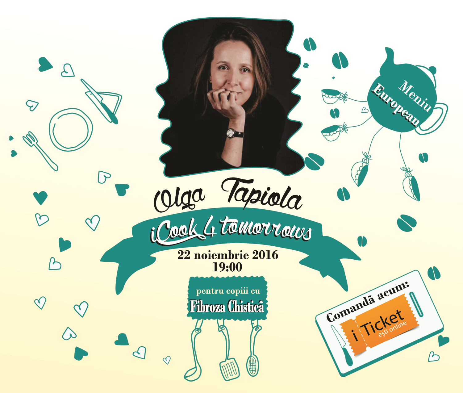 În cadrul campaniei, Asociația a invitat mai multe personalități publice să gătească o cină de binefacere într-un local din Chișinău. Este vorba despre Olga Tapiola, Liuba Florica, Luminița Suveică și Nata Albot. Fiecare bucătar „iCook for tomorrow” va fi responsabil de un meniu: gustare, felul principal și desert, plus un pahar de vin. Bucătarii voluntari, împreună cu un bucătar profesionist și echipa localului vor găti în timp real, vor prezenta pe viu cum gătesc și vor discuta cu oaspeții. Fiecare din cele șapte cine de caritate va găzdui tineri muzicieni și va organiza o licitație de caritate cu tablourile oferite de Irina Kara, cărți de la Sergiu Botezatu și o tombolă cu premii oferite de familiile care au copii cu fibroză chistică și prietenii lor.