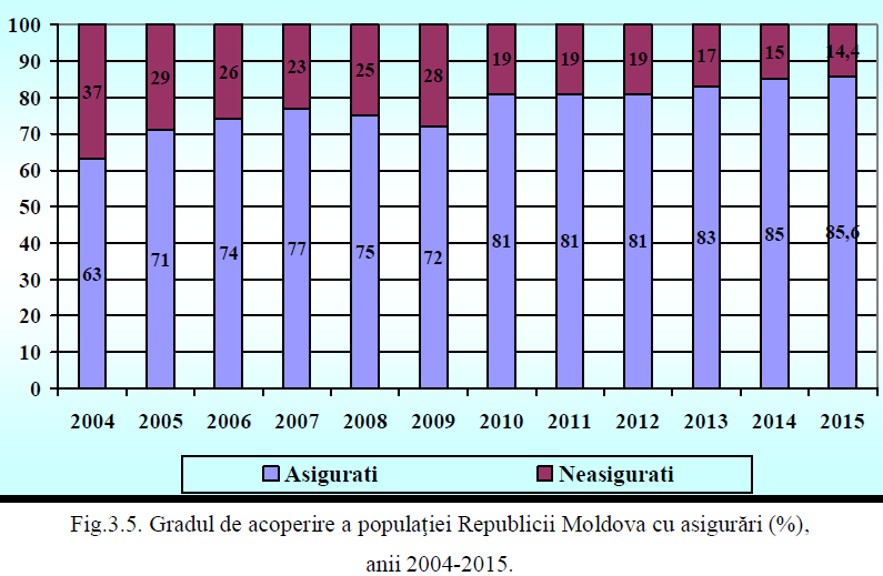 „Caracteristica indicatorilor cheie din ultimii trei ani și demonstrează o creștere a ponderii persoanelor asigurate în totalul populației de până la 85,6%. Cu toate acestea, indicatorul distorsionează într-o oarecare măsură situația reală, ținând cont că numărul total al persoanelor asigurate în 2015 scade cu peste 200 mii față de sfârșitul anului 2012. Cauza principală la baza acestor discrepanțe este numărul total al populației prezente în țară care continuă să scadă. Totodată, probabil din aceleași motive demografice, CNAM evită în rapoartele sale să publice și numărul total al contribuabililor la sistemul AOAM, or anume acest indicator ar putea da o apreciere faptului cât de sustenabile pot fi în timp veniturile din contribuțiile obligatorii”, menționează experții în studiul lor.