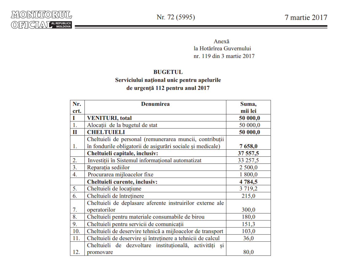 Printr-o hotărâre de Guvern, publicată pe 7 martie, autoritățile au decis să aloce 50 de milioane de lei pentru Serviciul 112. În această sumă se includ cheltuielile pentru procurarea unui sediu, pentru salarizare, tehnică de calcul, dar și pentru un soft informațional, pentru care autoritățile sunt gata să aloce peste 30 de milioane de lei.