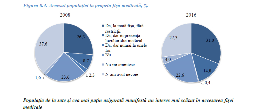 Accesul la fişa medicală este un alt drept, prevăzut în Legea cu privire la drepturile şi responsabilităţile pacientului. Dacă raportăm cifrele la anul 2008, atunci constatăm o îmbunătățire. Totuși, anul trecut nici jumătate dintre pacienți nu au avut acces la propria fișă medicală, mai exact vorbim de 46,2 la sută. Datele mai arată că din totalul celor care au putut vedea documentația medicală, numai 31 la sută au avut acces fără restricţii, 14,8 la sută - doar în prezenţa lucrătorului medical, iar 0,4 la sută au putut consulta doar unele pagini din fişa medicală. Totodată, aproximativ fiecare a patra persoană a menţionat că nu a avut acces la propria fișă medicală, iar 27 la sută că nici n-au fost interesați să le vadă.