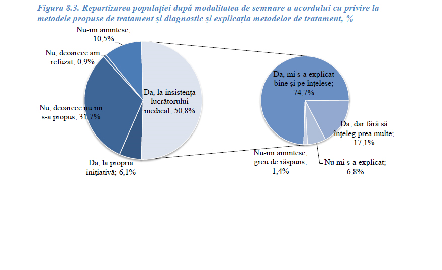 Același studiu relevă că numărul persoanelor care au semnat un document medical privind acordul metodelor propuse de tratament şi diagnostic a constituit 57 la sută. „Majoritatea celor care și-au dat acordul în scris au făcut-o la insistența lucrătorului medical. Totodată, o persoană din trei nu a semnat niciun document privind acordul metodelor propuse de tratament şi diagnostic, deoarece nu i s-a propus”, se menționează în studiul Biroului Național de Statistică. Datele mai arată că au refuzat conștient să semneze orice acord informat doar 0,9 la sută.