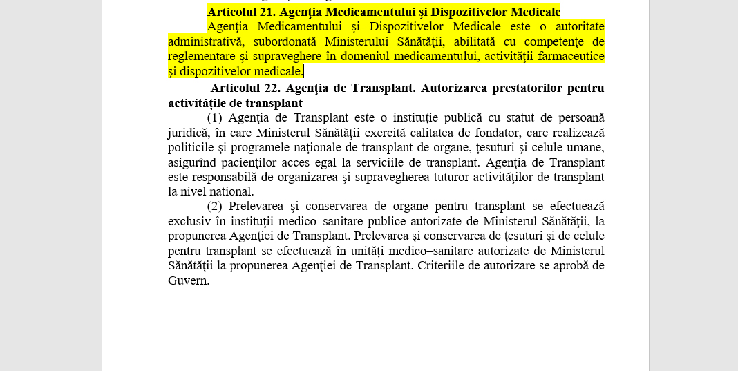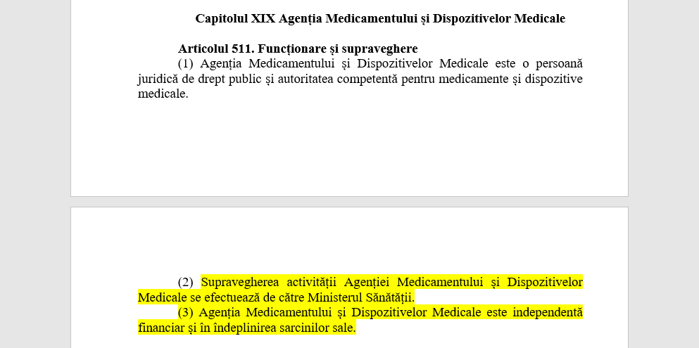 Ministerul Sănătății nu a ținut cont nici de aceste modificări la elaborarea Codului Sănătății, propus dezbaterilor publice, unde Agenția rămâne subordonată acestuia: