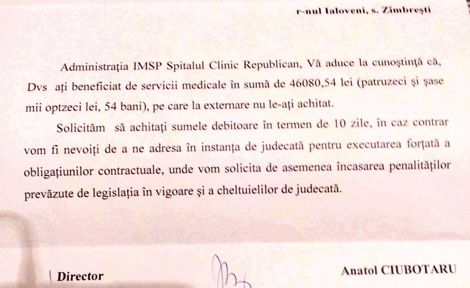 Mai mult, administrația Spitalului Clinic Republican a trimis acasă o scrisoare prin care îl somează pe tatăl ei să plătească suma, altfel va fi dat în judecată. Abia confirmat diagnosticul de cancer, umblând după hârtii pentru a putea obține morfina, și afectată de starea tatălui său, din care curge sânge și puroi, Valentina trebuie să se gândească acum de unde să facă rost de acești bani.