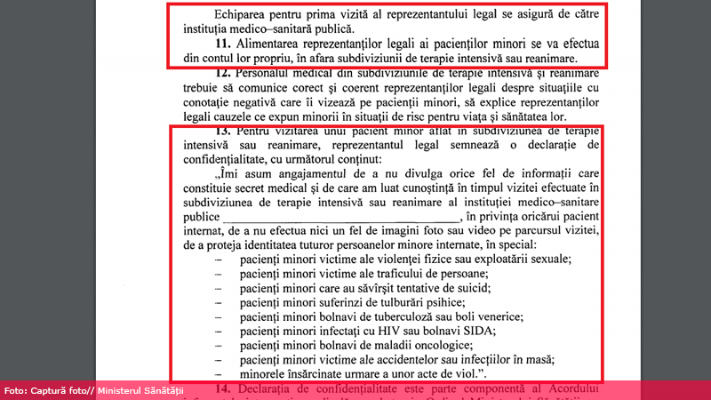 Spitalele vor permite părinților sau tutorilor să-și supravegheze copiii internați în secțiile de Terapie Intensivă și Reanimare. Minorii până la vârsta de trei ani vor putea fi însoțiți permanent de unul dintre membrii familiei. În cazul copiilor mai mari, accesul adulților va fi asigurat în funcție de posibilitățile instituției medicale.