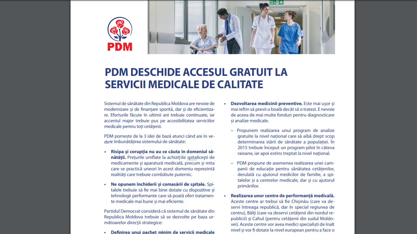 Această este o reproducere cu exactitate a retoricii PDM în campania electorală din 30 noiembrie 2014. „Ne opunem închiderii și comasării de spitale. Spitalele trebuie să fie mai bine dotate cu dispozitive și tehnologii performante care să poată oferi tratamente medicale mai bune și mai eficiente. Partidul Democrat consideră că sistemul de sănătate din Republica Moldova trebuie să se dezvolte pe baza următoarelor direcții strategice: definirea unui pachet minim de servicii medicale pentru fiecare cetățean, mărirea salariilor în medicină, dezvoltarea medicinii preventive, realizarea unor centre de performanță medicală”, promitea PD. În aceeaşi ordine de ei, acelaşi partid promitea că va asigura o descentralizare a sistemului de sănătate.