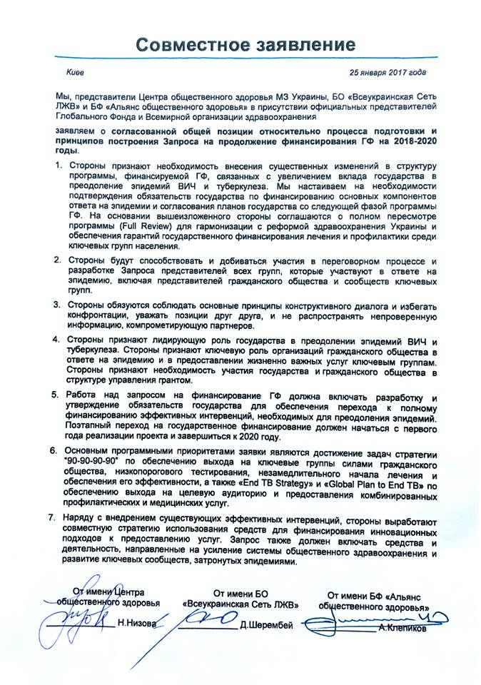 Programele naționale de prevenire și control a epidemiei HIV și TB în Ucraina vor fi gestionate de trei recipienți principali cu care urmează să colaboreze Fondul Global de luptă cu HIV/SIDA, TB și Malarie. Autoritățile din țara vecină au încercat să excludă societatea civilă din acest proces, așa cum se întâmplă acum în Republica Moldova, însă părțile s-au așezat la masa de negocieri și într-un final au semnat o declarație comună prin care părțile se angajează să depună eforturi considerabile, fiecare pe segmentul său, dar strâns coordonate pentru a diminua la maxim cele două epidemii.