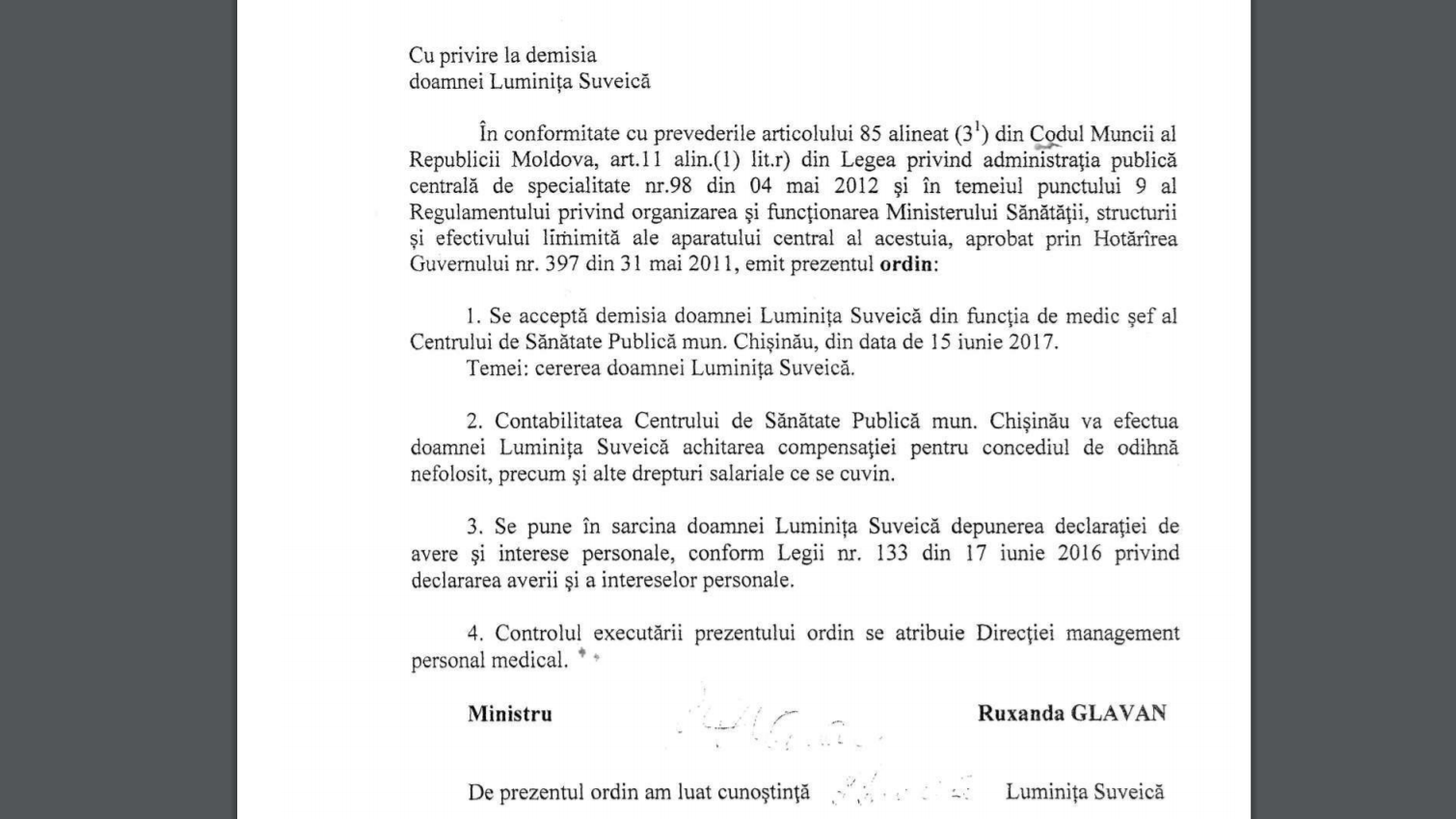 Vom aminti că Luminița Suveică a fost eliberată din funcția de medic-șef sanitar de stat a Municipiului Chișinău și respectiv director al Centrului Municipal de Sănătate Publică pe 15 iunie. Pe 20 iulie, Ruxanda Glavan o numește pe Suveică în aceeași funcție, fără să fie clară nici eliberarea și nici reangajarea acesteia.