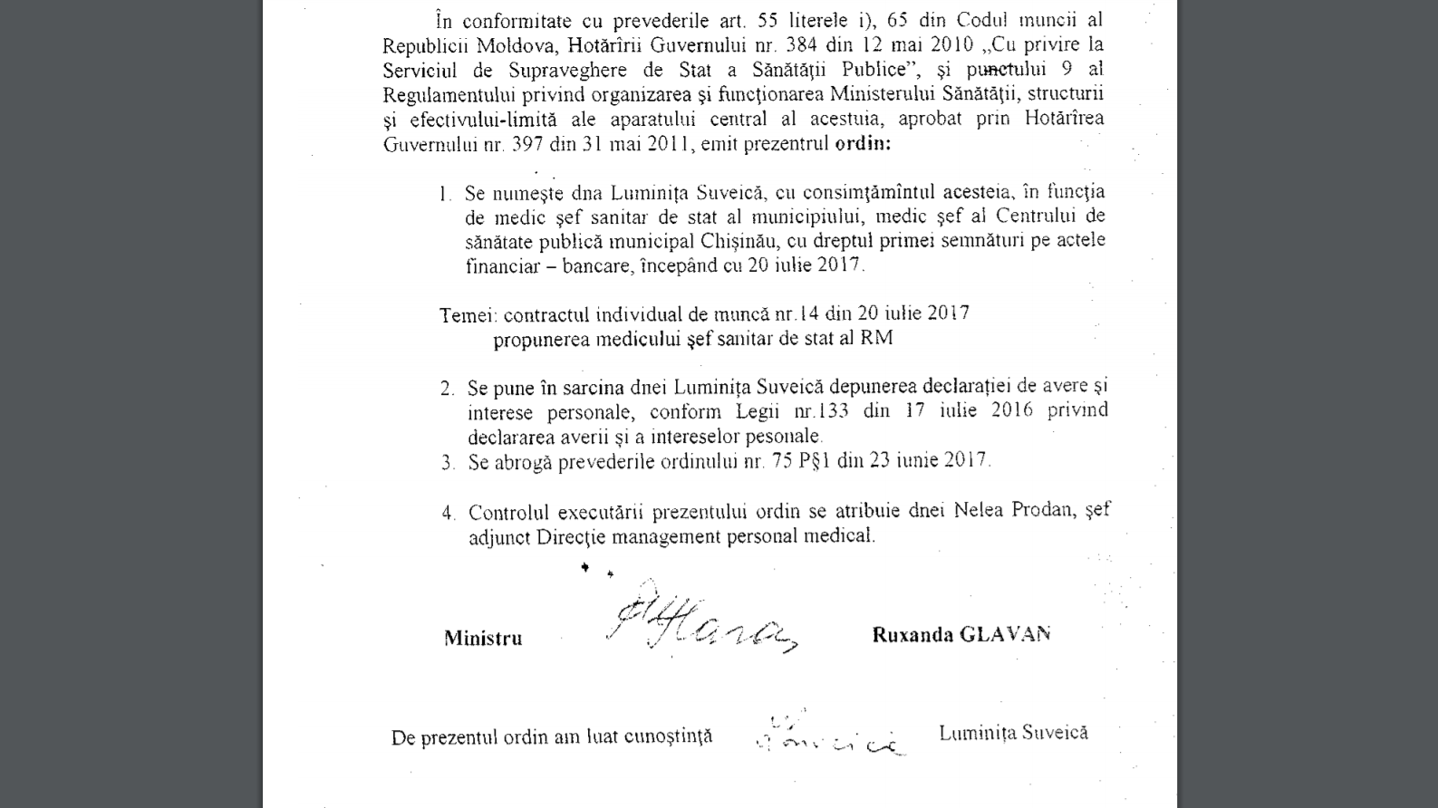 Într-adevăr, ambele ordine de eliberare și apoi de numire în funcție a Luminiței Suveică sunt semnate de fostul ministru al Sănătății, Ruxanda Glavan. Doar în cel de reangajare, de pe 20 iulie 2017, scrie într-o frază scurtă că Luminița Suveică revine în funcție, „în temeiul contractului individual de muncă, la propunerea medicului-șef sanitar de stat al Republicii Moldova”. În hotărârea de Guvern nr. 384 cu privire la Serviciul Supravegherii de Stat a Sănătății Publice scrie însă că „numirea și eliberarea din funcție a adjuncților medicului-șef de stat al țării se face de către ministrul Sănătății, la propunerea medicului-șef sanitar de stat al Moldovei.
