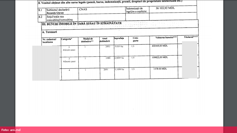 Tot în 2016, familia Ruxandei Glavan mai declară în proprietatea sa două terenuri extravilane și intravilane în valoare totală de 511 mii 969 de lei, un apartament cu suprafața de 66,8 metri pătrați în valoare de 401 mii 136 de lei, moștenit în 2011 și două case de locuit, cu terenuri aferente de 55 de ari și respectiv 69,7 ari. Casa cu o suprafață de 349 de metri pătrați valorează, potrivit declarației, 1 milion 736 de mii 776 de lei, fiind dată în exploatare în anul 2006. Cea de-a doua casă are o suprafață de 50,5 metri pătrați și valoarea ei este de 97 de mii 759 de lei.