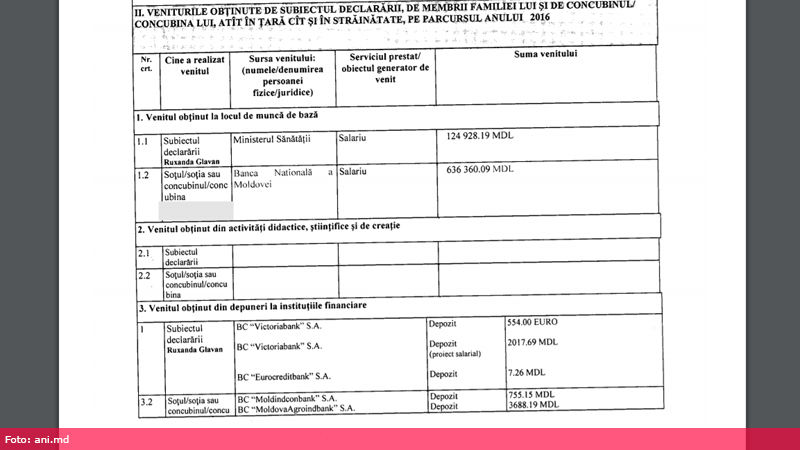 Astfel două conturi bancare curente sunt deschise la Victoriabank – unul în valoare de 22.592.93 de euro la o dobândă de 2.25% și altul – de 13.280.70 mii lei la o dobândă de 7% anual din care fosta ministră a Sănătății a obținut o dobândă de 2.017.79 de lei. Un alt cont bancar, Glavan îl are deschis la EuroCreditBank. Valoarea acestuia este 367 de lei, dobânda anuală fiind de 7% și altul î
