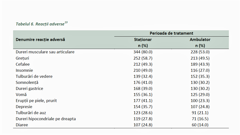 Reacțiile adverse raportate au fost: durerea musculară sau articulară, ca fiind cele mai frecvente, apoi grețurile, cefaleea, tulburările de somn, tulburări de vedere sau auz, erupții pe piele sau pruritul, dureri la nivelul hipocondrului drept care pot semnala mai multe maladii.