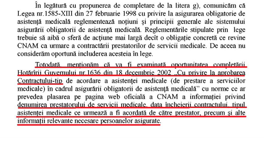 Așadar, prin modificările operate, CNAM nu a făcut decât să neglijeze propunerile făcute până acum și să adopte poziția Guvernului. Adică, compania se oferă „să plaseze pe pagina sa web oficială, în termen de 15 zile de la data încheierii contractului de acordate a asistenței medicale, informația privind denumirea prestatorului de servicii medicale, data încheierii Contractului, tipul asistenței medicale ce urmează a fi acordat de prestator, precum și alte informații relevante necesare persoanelor asigurate”. Ce înseamnă „informații relevante necesare” nu au explicat nici Guvernul, nici CNAM.