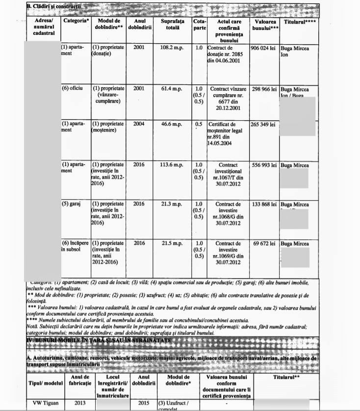 Pentru anul trecut, Mircea Buga a mai trecut în declarația sa de venit și interese un apartament, un garaj și un subsol, pe care le-a cumpărat în rate în perioada 2012-2016.