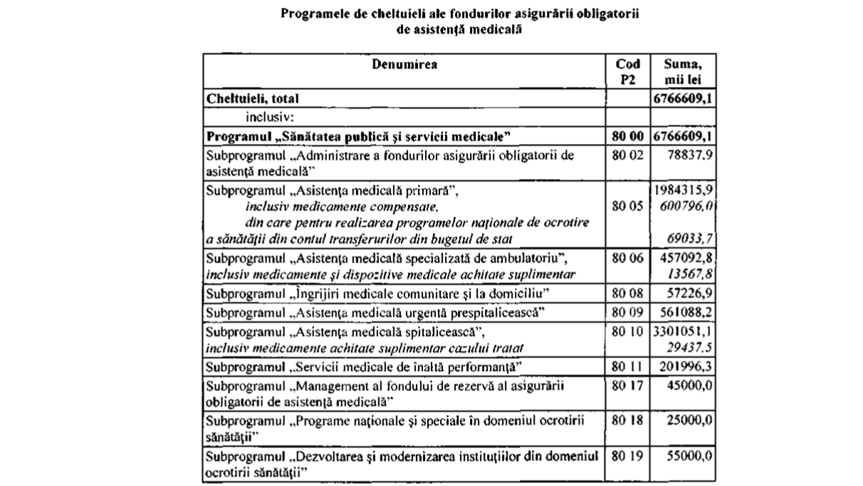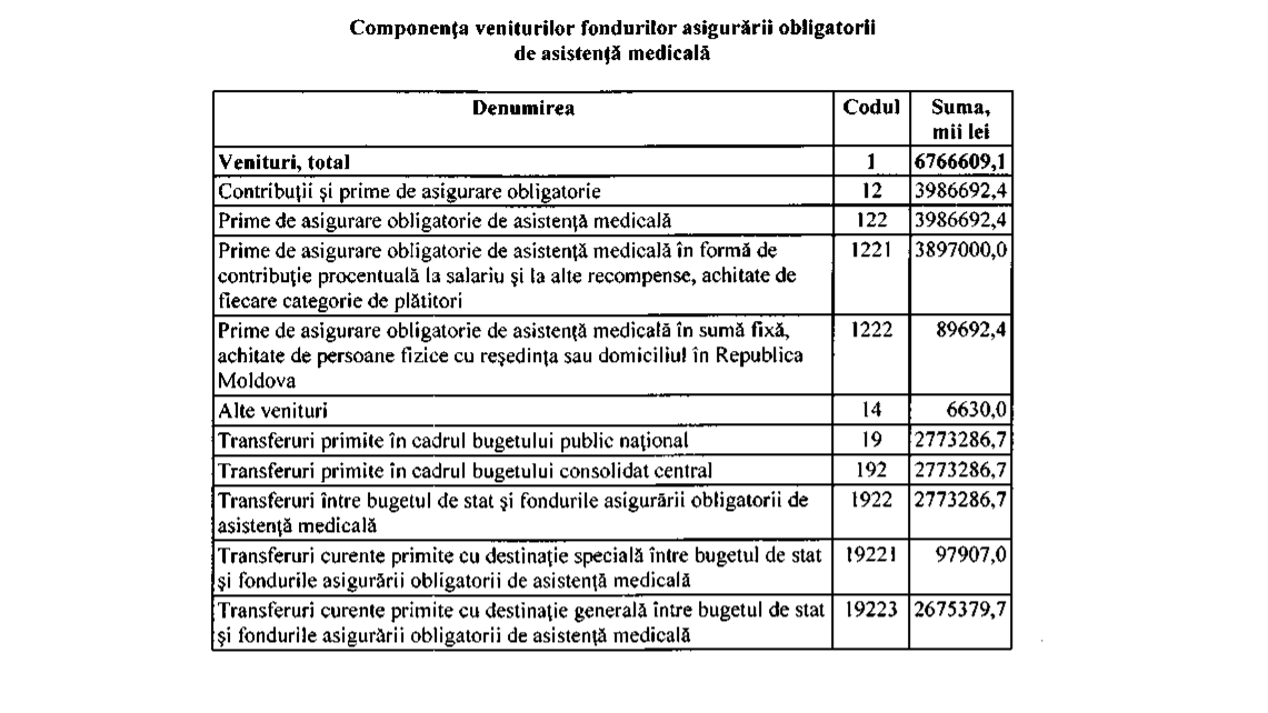 Fondul de bază va constitui 6 miliarde 562 de milioane de lei, în creștere cu doar jumătate de milion de lei. Fondul de rezervă este în scădere și va constitui 45 de milioane de lei. Fondul măsurilor de profilaxie rămâne la același nivel, iar cel de dezvoltare va crește în jumătate. Fondul de administrare rămâne la același nivel.
