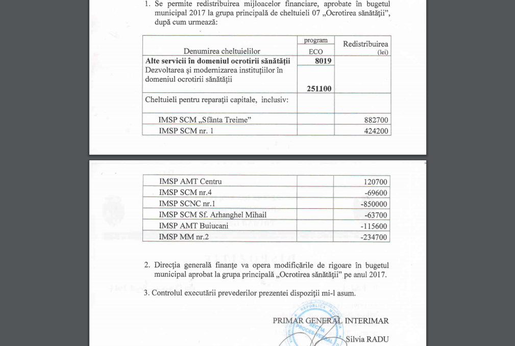 AMT Buiucani se desparte de 115.000 lei (aproximativ 5.500 euro), care sunt direcționați către AMT Centru, aceasta din urmă va beneficia de 120.000 de lei în conturi. De la balanța Spitalului Clinic Municipal nr 4 și de la Arhanghelul Mihail vor fi redistribuite câte 69.000 și respectiv 63.000 de lei.