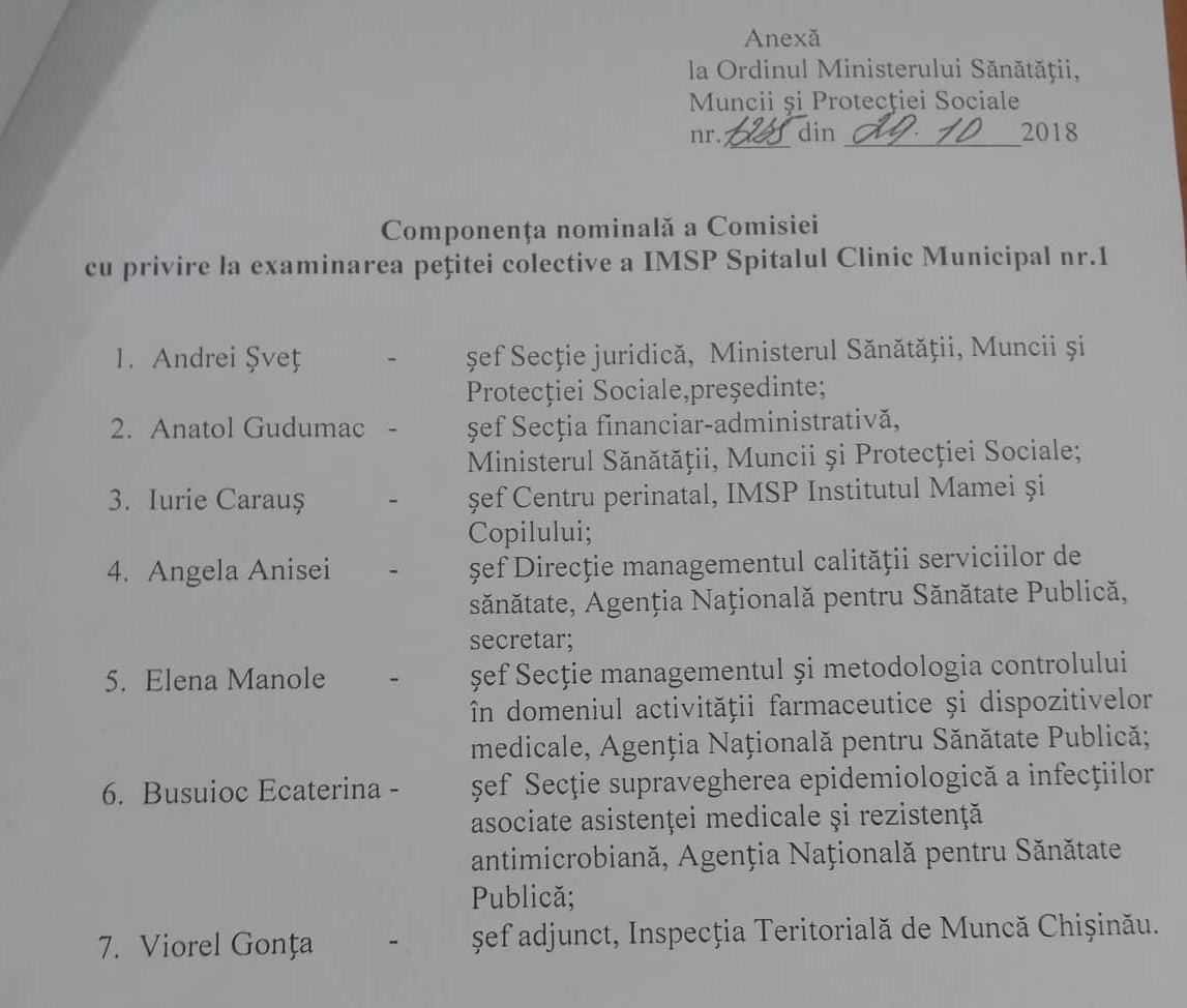 Comisia va examina petiția colectivă înaintată de angajații spitalului până pe 1 noiembrie. Președintele comisiei Andrei Șveț, șeful secției juridică al Ministerului Sănătății, Muncii și Protecției Sociale va prezenta rezultatele anchetei peste o săptămână. Din comisie fac parte reprezentanți ai Ministerului Sănătății, Muncii și Protecție Sociale, Agenției pentru Sănătate Publică, Institutului Mamei și a Copilului și Inspecției Muncii.