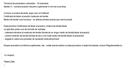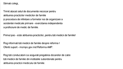 Inițial, am fost anunțați de un medic de familie din Orhei că a fost nevoit să scrie, până pe data de 18 noiembrie, o cerere de atribuire a practicii. Anunțul a venit de la administrație care, la rândul ei a primit un mail cu indicațiile de rigoare de la Tatiana Zatâc, responsabilă la minister de asistența medicală primară, urgentă și comunitară. În mail, Zatâc explică ce acte trebuie să conțină dosarul pentru concursul de atribuire a practicilor. În primul rând este vorba despre cererea de atribuire a practicii, adică a sectorului de populație unde medicul dorește să activeze. Toți medicii sunt obligați să scrie astfel de cereri, menționează funcționarul, cu precizarea: