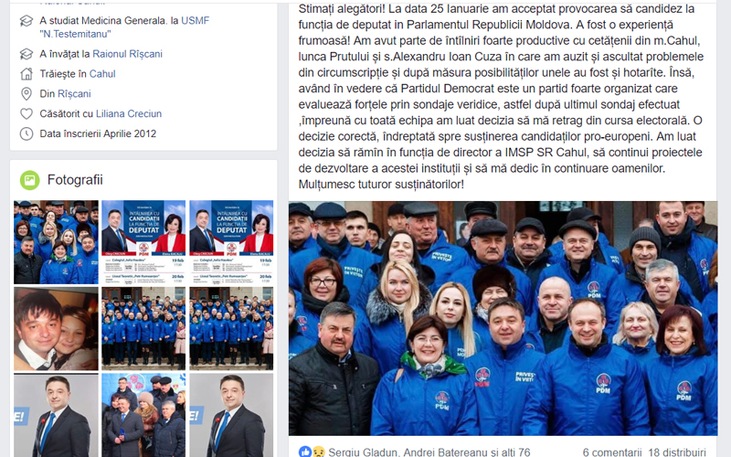 Directorul Spitalului Raional Cahul, Oleg Creciun, fost viceministru al Sănătății în mandatul Ruxandei Glavan s-a retras din cursa electorală. Candidatul democraților a făcut anunțul pe pagina sa de Facebook. Acesta spune că a luat decizia după ce formațiunea politică i-a evaluat șansele de a deveni parlamentar și s-a retras pentru „susținerea candidaților pro-europeni”.